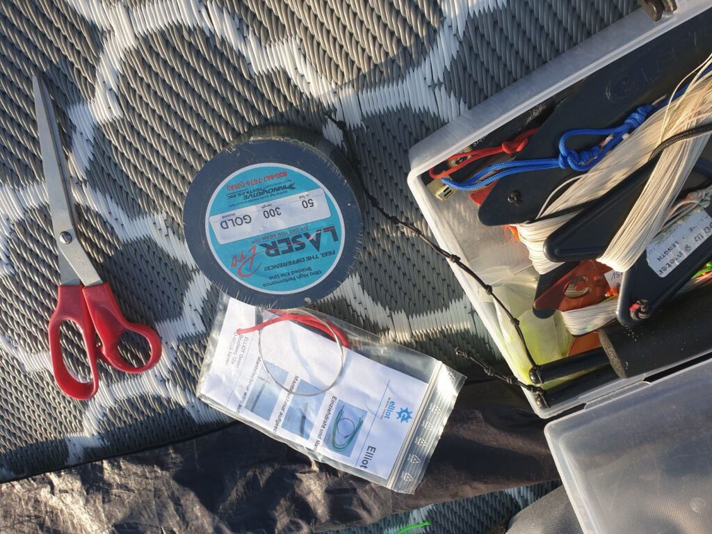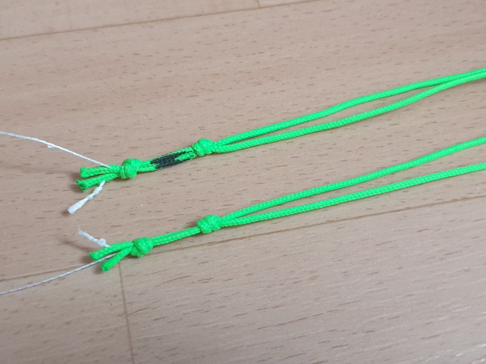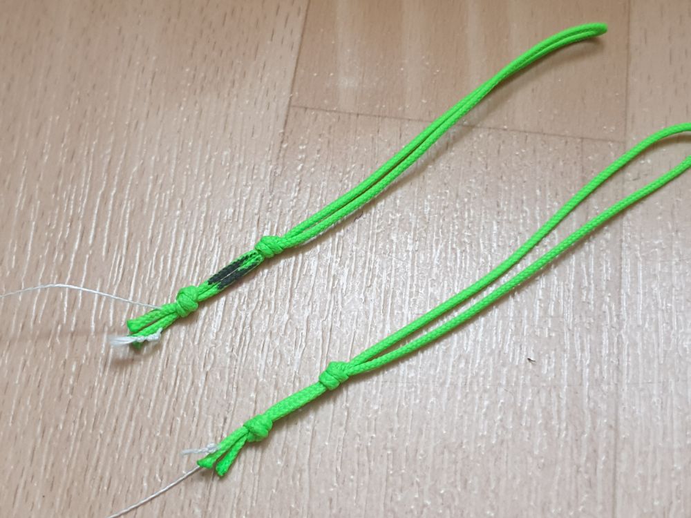 La confection des lignes de 4 lignes est une opération certes plus longue que pour les 2 lignes puisque qu’il y a 2 fois plus de lignes mais qui requiert aussi plus de soins car les lignes sont aussi plus fine que pour les 2 lignes. En effet on ne dépasse pas les 40 kg de résistance en 4 lignes et la ligne est encore plus fine si on descend jusqu’à 23 kg de résistance. L’opération de gainage nécessite alors un peu de minutie.