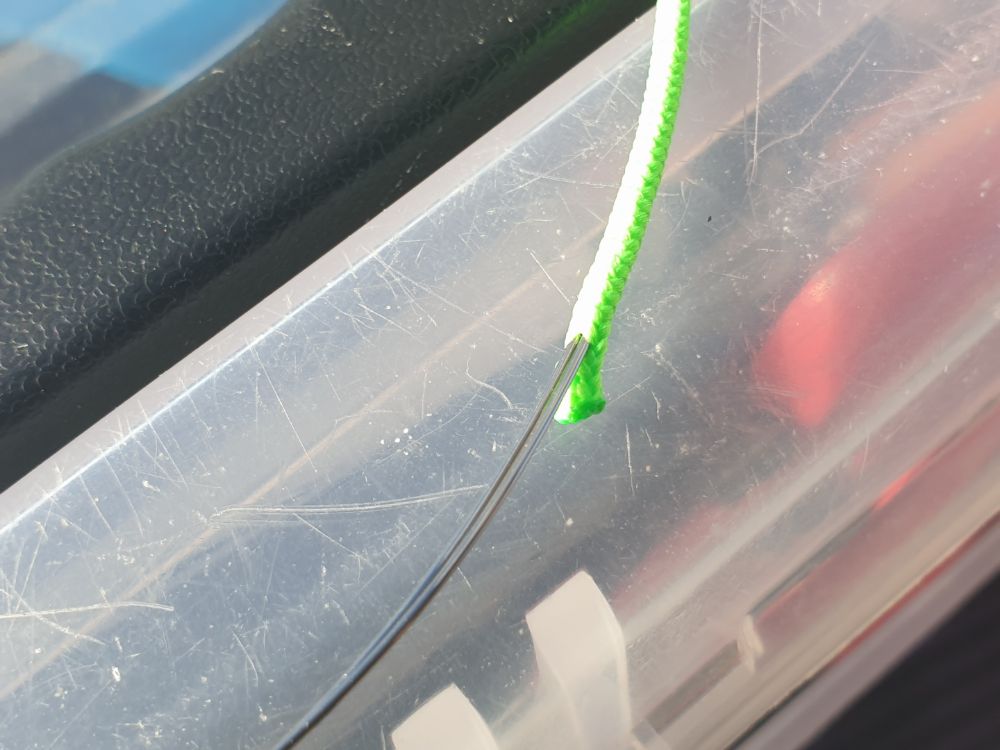 NB: si on utilise une simple aiguille à coudre alors le passage de la ligne dans la gaine se fait en une seule étape mais plus laborieux.