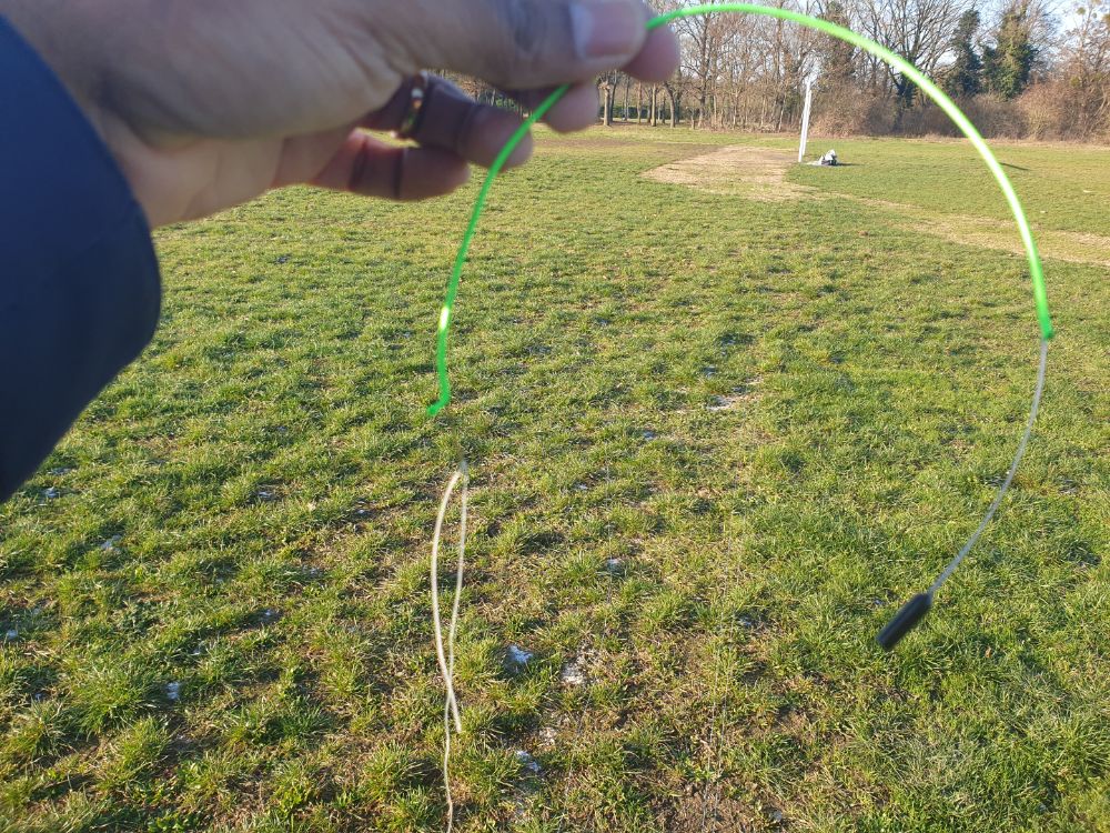 Je ne rentre pas dans la partie de découpage de la la ligne à la bonne longueur pour n’aborder que la mise en place de la gaine à l’extrémité de la ligne car l’objectif est d’avoir une gaine qui ne « boudine » pas et qui soit facile à défaire pour l’égalisation. Il faut choisir une gaine la plus fine possible et pour les 2 résistances qui nous intéressent 40 et 23 kg, une gaine de 0.8mm de diamètre est parfaite. Une gaine trop grosse va « boudiner » car la ligne va glisser dans la gaine comme illustré ici: