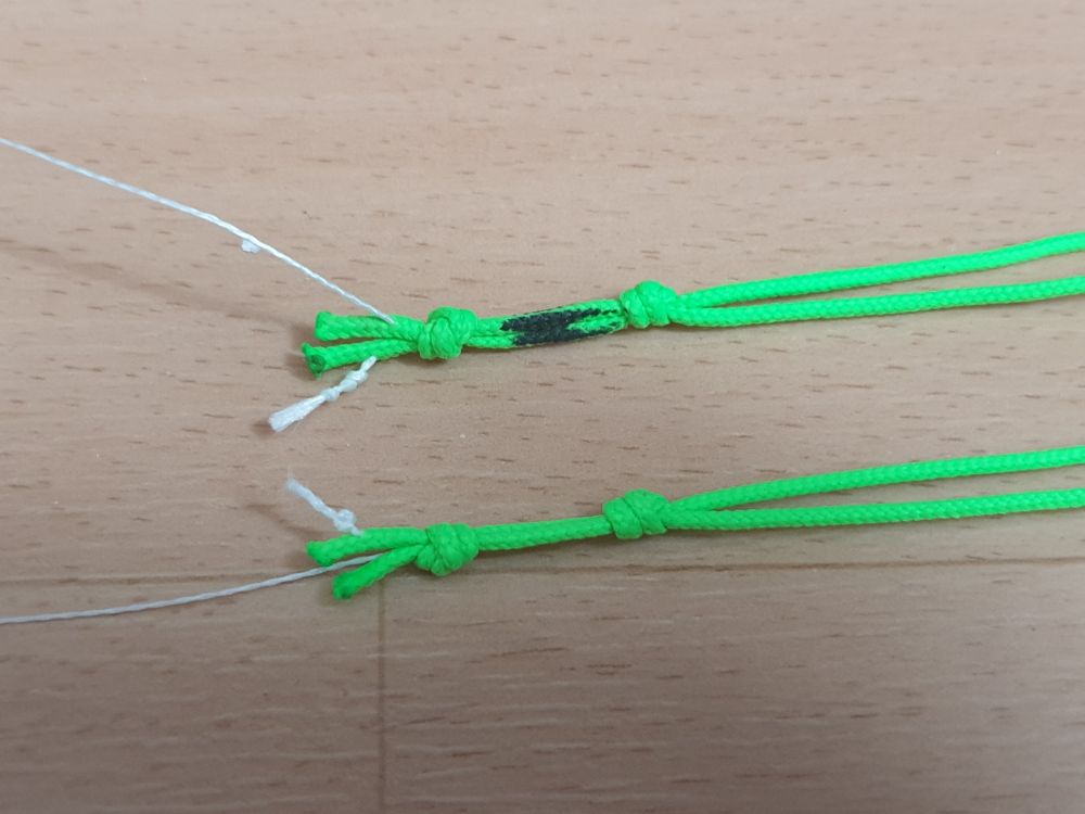 On saisie ensuite cette l’extrémité de la gaine et on tire sur la ligne de l’autre côté afin de bloquer la ligne grâce aux nœuds. On vérifie ainsi notre protection qui évite de perdre la ligne dans la gaine. Puis à l’extrémité on saisie à la fois la lignes et la gaine pour lisser la gaine avec l’autre main. A ce stade la gaine est bien étirée sur la ligne et il ne reste qu’à la refermer. Pour cela je plie la gaine en deux parties. Je pince le bout qui servira à faire la tête d’alouette quand tout sera fini, afin de lisser les 2 parties de nouveau car l’étape de pliage provoque un léger retrait de la gaine propice au « boudinage ». Maintenant on vérifie que les 2 extrémités de la gaine sont au même niveau et on fait un nœud avec la gaine après la sortie des lignes. Ce nœud bloque l’extrémité de la ligne pour qu’elle ne sorte pas. Finalement on ajoute un second nœud à environ 1 cm, ce nœud bloque les mouvements de la gaine sur la ligne car la gaine est élastique et même si on a lissé, elle peut se toujours se rétracter causant le boudinage.